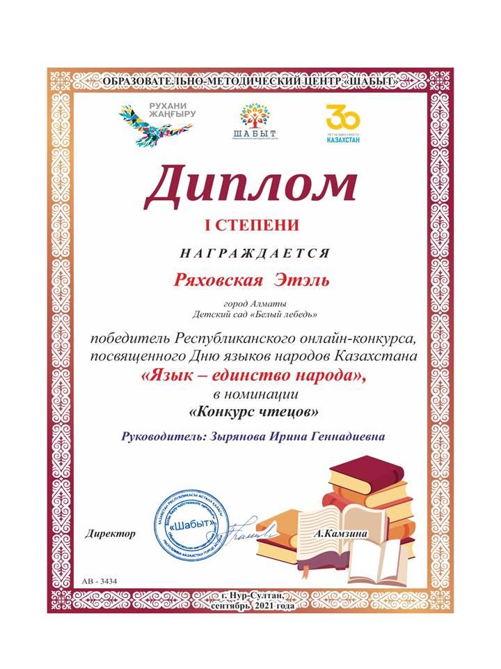 Қазахстан хылқының Тілдер күніне арналған «Тіл –халықтың бірлігі» атты Республикалық онлайн байқауында «Мәнерлеп оқу» номинациясы » «ТОО «Центр Белый Лебедь»